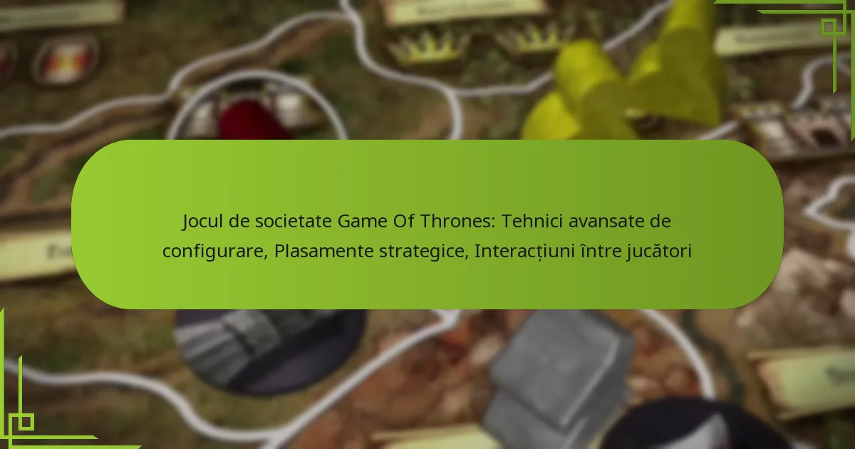 Tehnicile avansate de configurare pentru jocul de societate Game of Thrones implică aranjamente și plasamente strategice care îmbunătățesc jocul și interacțiunile între jucători. Prin optimizarea aranjamentului tabloului de joc, plasarea cărților și înțelegerea avantajelor specifice fiecărei case, jucătorii își pot îmbunătăți semnificativ șansele de succes.